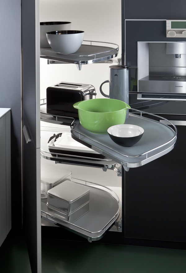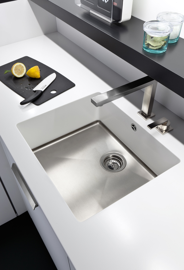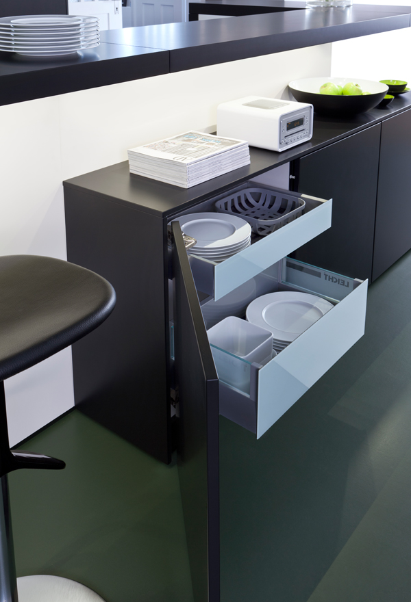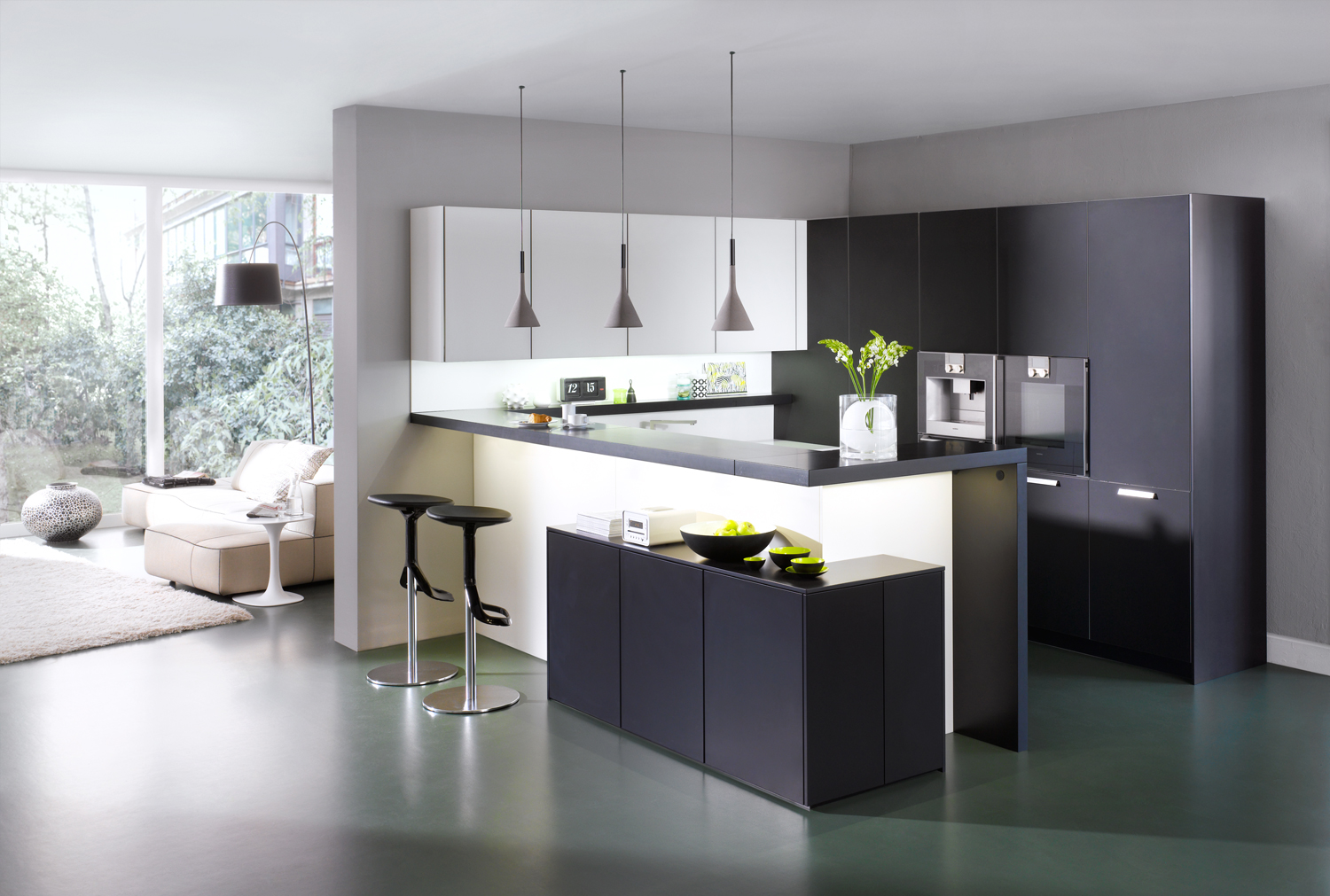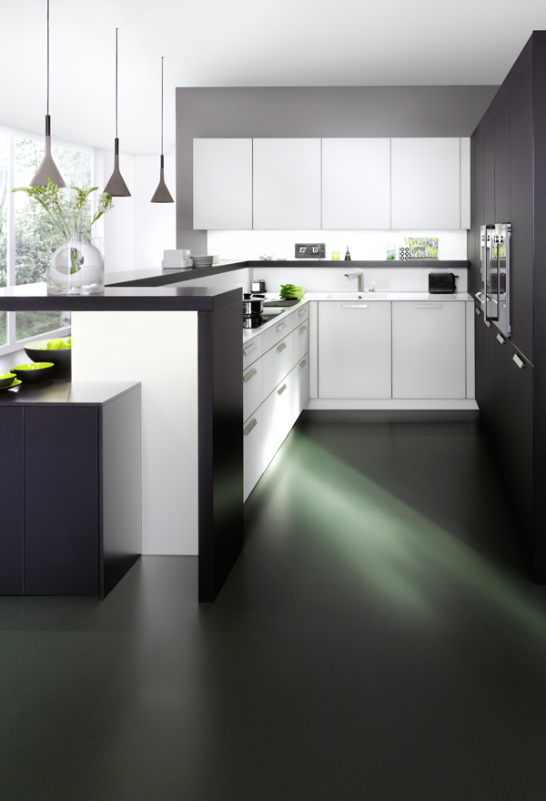 Light and dark shades seamlessly combine in this luxurious modern classic kitchen. The handle-less surfaces, with their smooth finishes, retain a neat, sleek appearance. The attached breakfast bar encloses a semi-open kitchen that is ideal for both cooking and preparing.
