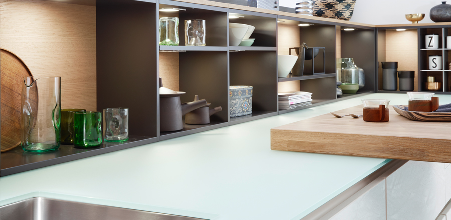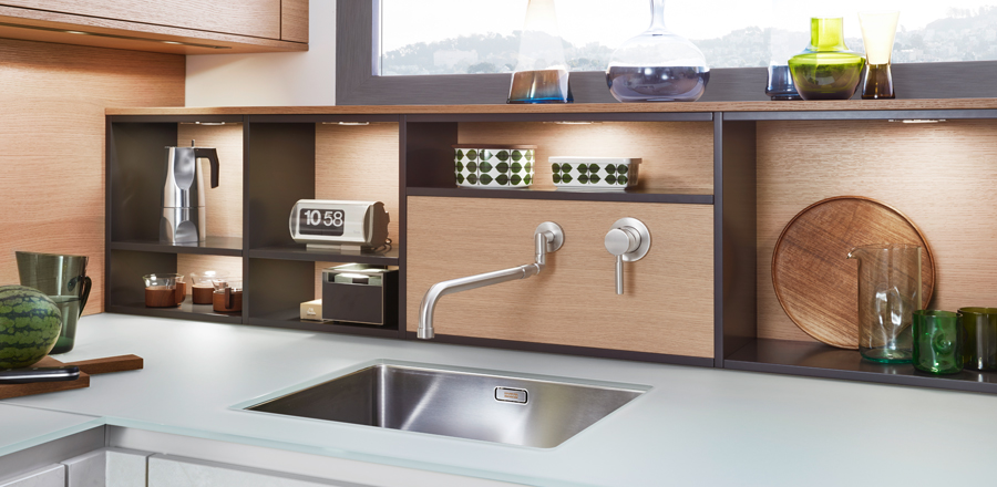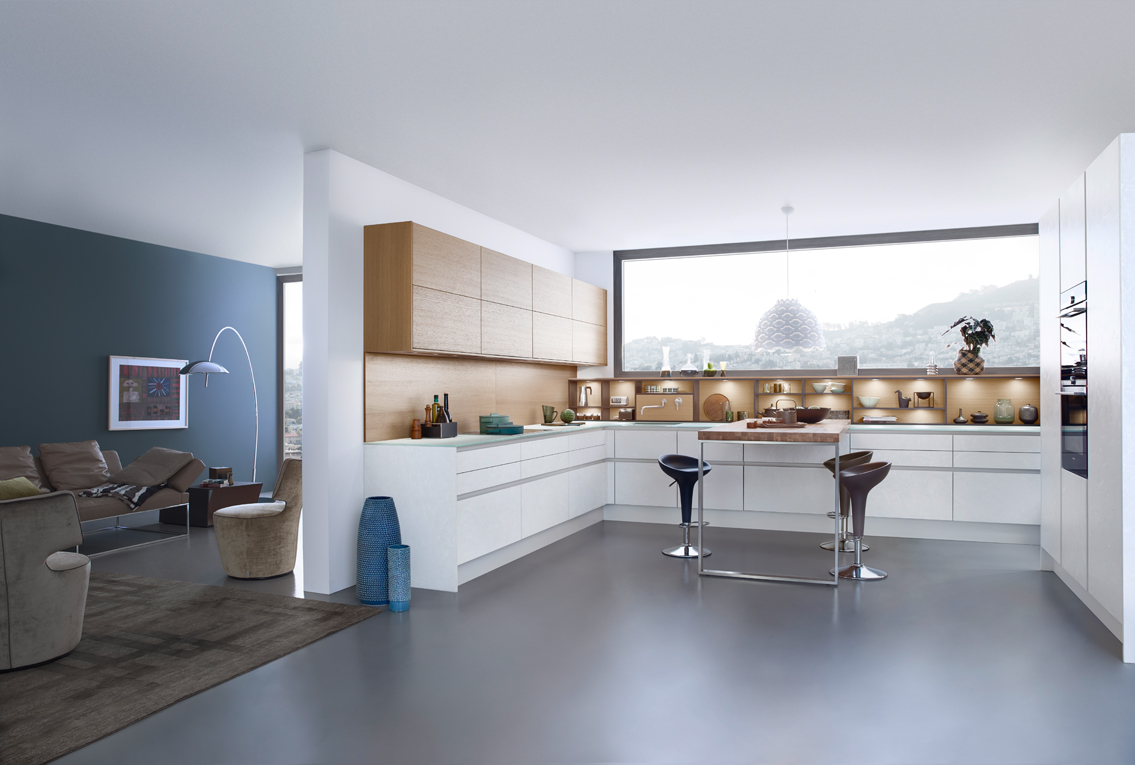 The Concrete range from Kube, is made from a layered and coloured concrete which is applied by hand and then polished and lacquered to a beautiful matte finish. Shown here in white, the concrete combined with the soft warmth of the wooden shelving, is balanced by the white walls and cladding. An adjoining breakfast bar with a wooden top and metallic legs possesses a sleek, modern touch. Asymmetrical open shelves are matte lacquered and available in exclusive Le Corbusier and RAL colours of your choice.