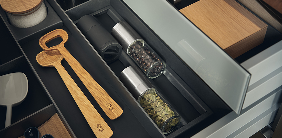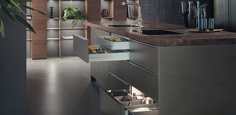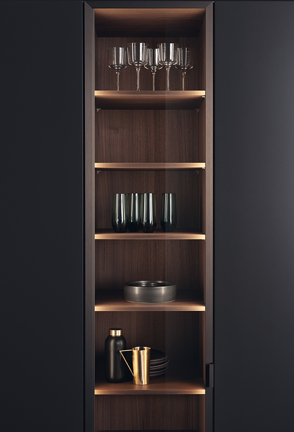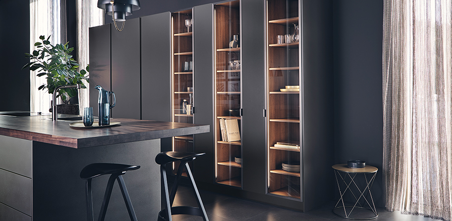 A combination of steel and walnut in this beautiful kitchen creates an aesthetically appealing space that is ideal for both cooking and entertaining. The incomparable look of distressed steel on the doors is achieved by spraying the metal on, and smoothening it to a lacquered finish. The result is a natural look with a textured surface that is pleasant to the touch. An interplay of glass, metal, and wood results in a refined design with an unparalleled elegance.