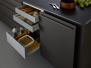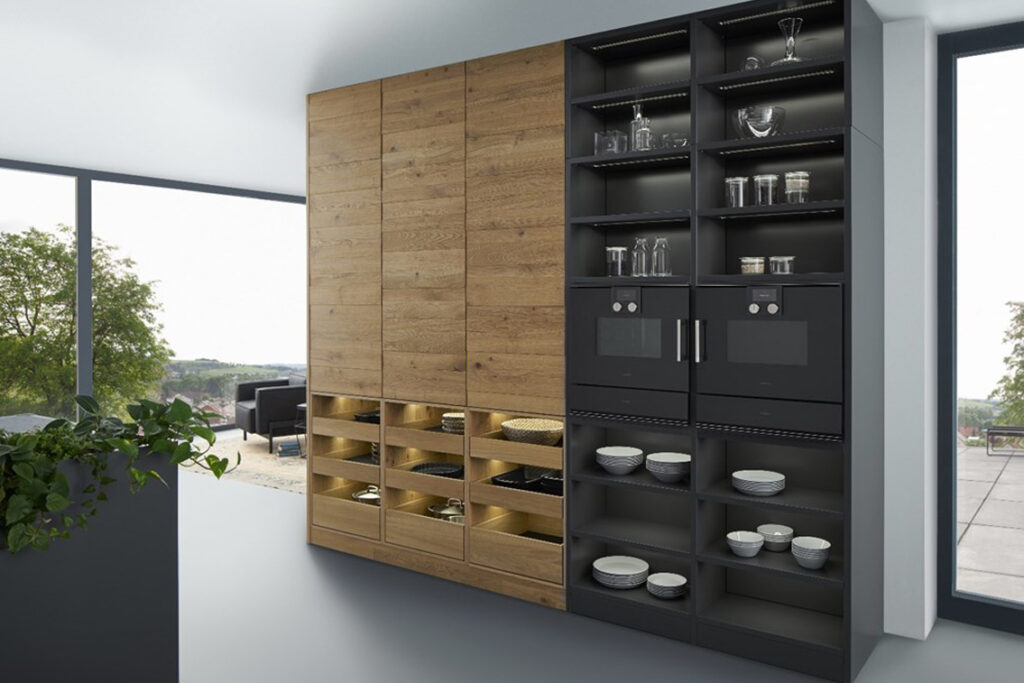 Kitchen cabinets are a major part of any kitchen design. Here, structured wood in a warm tonality creates a magnificent contrast to the matt lacquer in cool carbon grey.