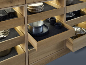 This solid colour scheme harmonises seamlessly with the textured wooden finishes of the kitchen cabinets. Adding open pull-outs to a larger cabinet unit can help to add interest with a sleek appearance. Pull-out drawers in metallic surfaces provides just the right hint of sheen to the space. And smart storage solutions allow you to keep things tidy with enough trays and dividers. The symmetry and finesse of this kitchen comes from the discreetly lit display cabinets and open shelving. The precise contours of fronts and worktop contrast with the oak surface, which complements the smooth cladding and neat lines of this kitchen. The handle design, front colour and worktop type can change according to your preferences. However, we recommend including an anti-fingerprint finish on the plain-coloured surface of your choice. This will add a touch of distinction while protecting the cabinet from water, dust, oil and fingerprints.