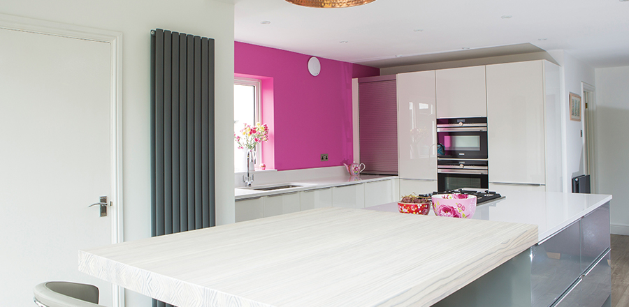 This kitchen in the Kube Envy range combines White and Mineral Grey Ultra High Gloss lacquered finishes with a quartz worktop. The breakfast bar is a bespoke solid wood worktop from our supplier Spekva.