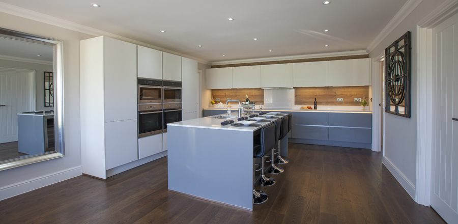 The houses are fitted with a custom-designed Kube kitchen, featuring mineral grey and white handle-less units in a matte finish. Silestone work surfaces lend a smooth, sleek touch. Perfectly complemented by a Canadian Oak backsplash, Miele appliances, a Blanco sink and a Quooker tap, this design combines aesthetics and functionality. This beautifully designed kitchen is further enhanced by the Caple wine cooler, a Siemens induction hob, and mood-inducing LED lighting.