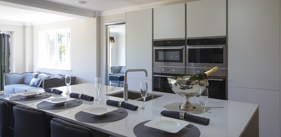 The houses are fitted with a custom-designed Kube kitchen, featuring mineral grey and white handle-less units in a matte finish. Silestone work surfaces lend a smooth, sleek touch. Perfectly complemented by a Canadian Oak backsplash, Miele appliances, a Blanco sink and a Quooker tap, this design combines aesthetics and functionality. This beautifully designed kitchen is further enhanced by the Caple wine cooler, a Siemens induction hob, and mood-inducing LED lighting.