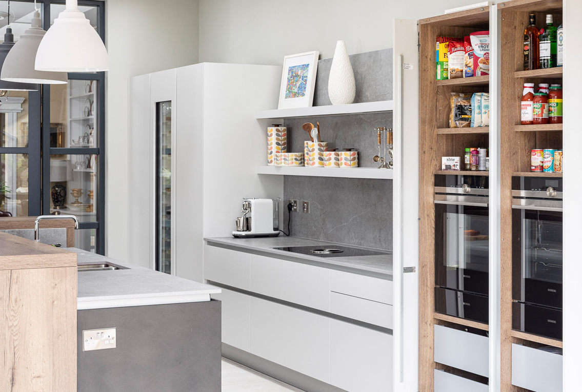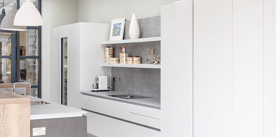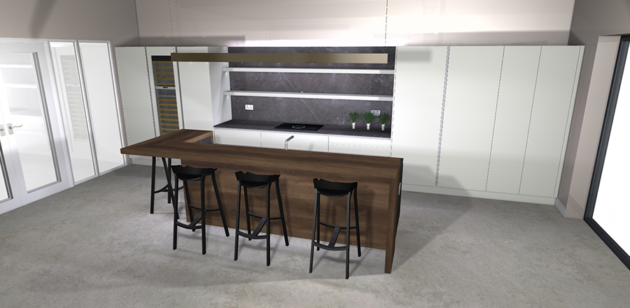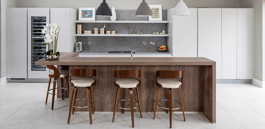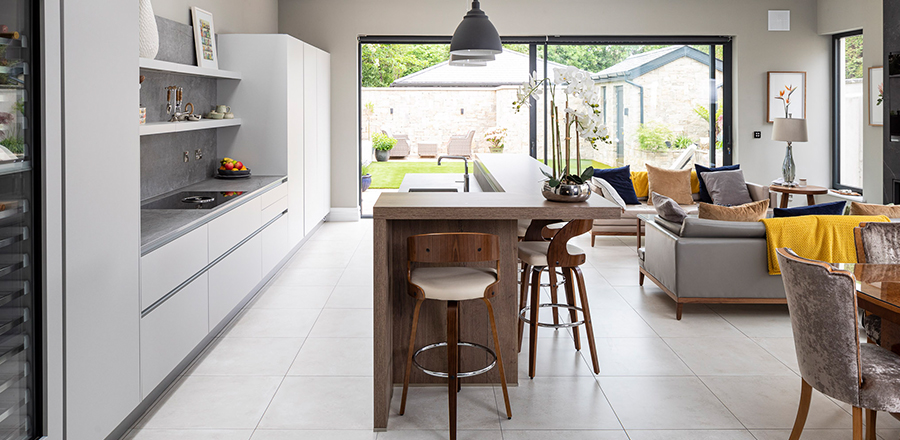 Design: To reflect the characteristics of the construction, we used Platinum from the Leicht Ceres-C Range accompanied by a hand finished concrete surface in Brasilia on the island. A breakfast bar in Limes Oak with matching cladding on the front is reminiscent of a timeless aesthetic. The Dekton Keon worktops possess a sleek, contemporary appearance.