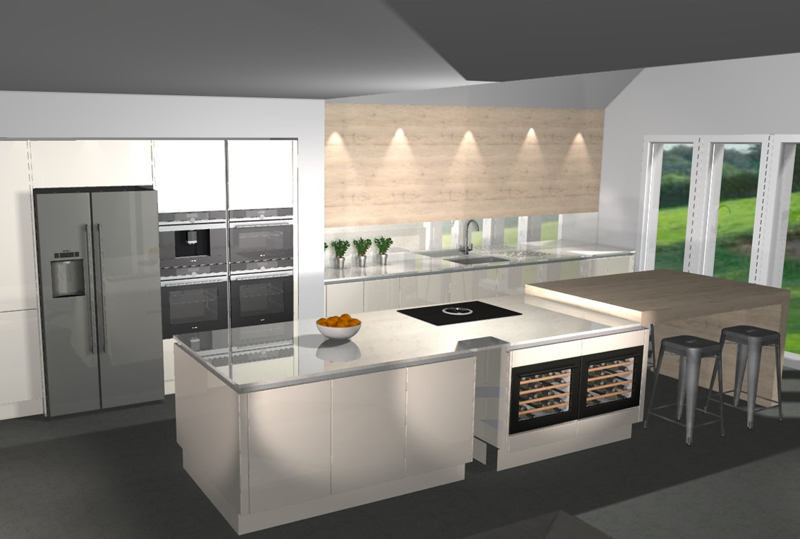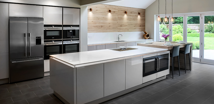 Design: We supplied a Leicht kitchen with the door range Sirius-C in a Sand Grey gloss. The design includes a Bora induction hob with built-in extraction and a full Siemens pack. The worktops are Calacatta Gold from Silestone. The design also features a breakfast bar and backsplash in an antique oak finish.