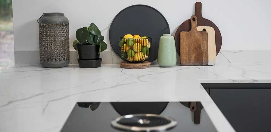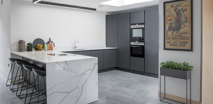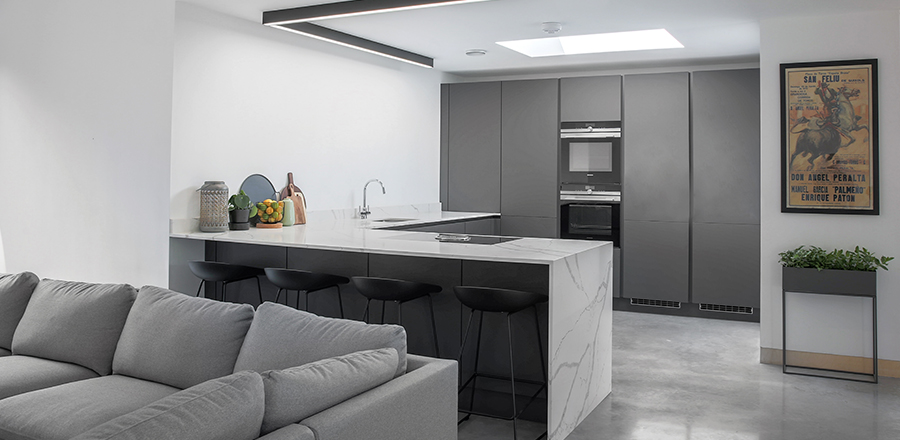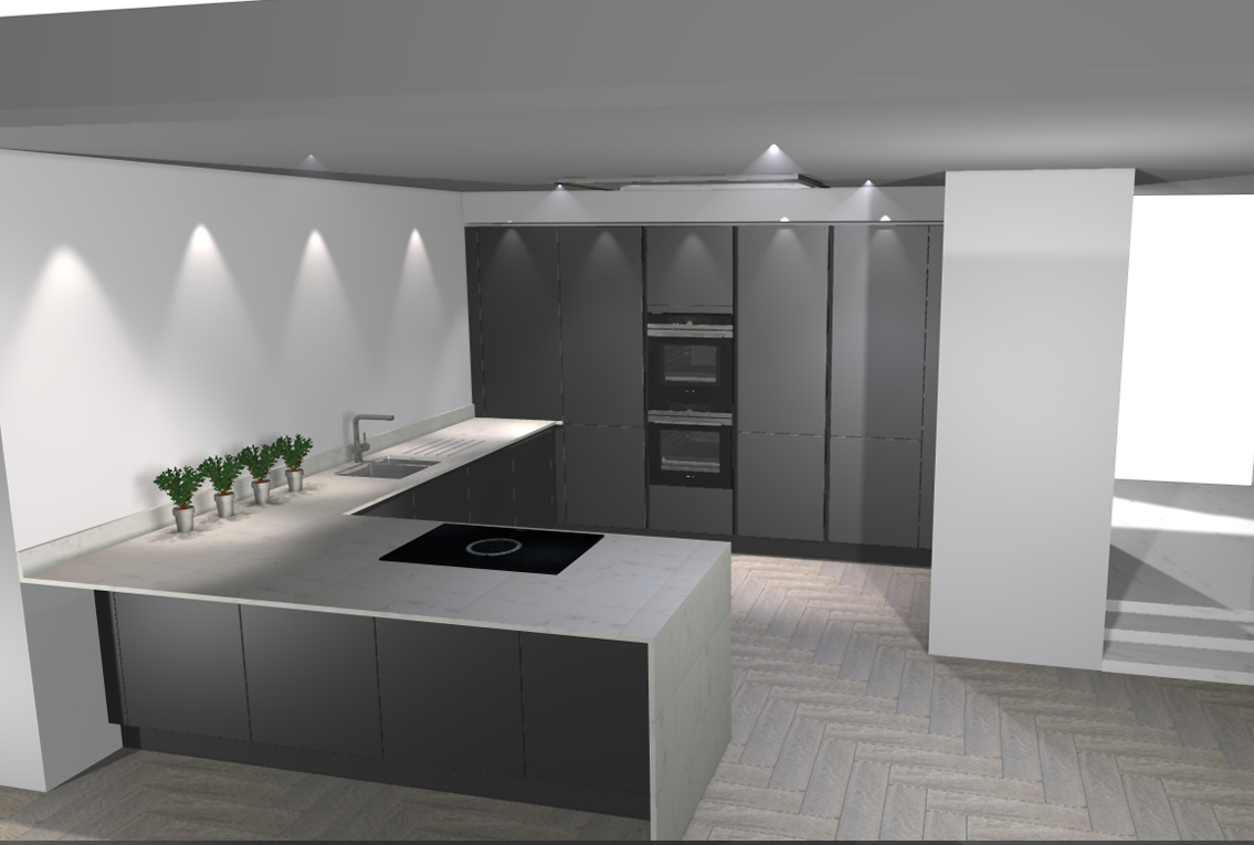 Design: In keeping with the contemporary style, the client approached us to design a modern handle-less kitchen. We supplied a Leicht kitchen with a Bondi-C door range in Carbon Grey. It includes a Bora hob alongside a full Siemens pack. The worktops are marble effect quartz, with the waterfall gable lending it a distinctive edge. The kitchen finishes that were chosen are in keeping with the subtle colours of painted white walls and polished concrete floors.