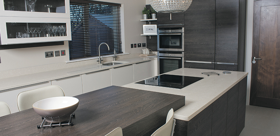 This kitchen area was dark, long and narrow. Designing it in different levels and shapes, has given the room a lighter air and a greater sense of spaciousness. The design is thoroughly modern and incorporates an attractive casual dining area, attached to the island. The contemporary design is softened by the use of warm colour combinations – Chic Cream Gloss and Vista Dark Oak.