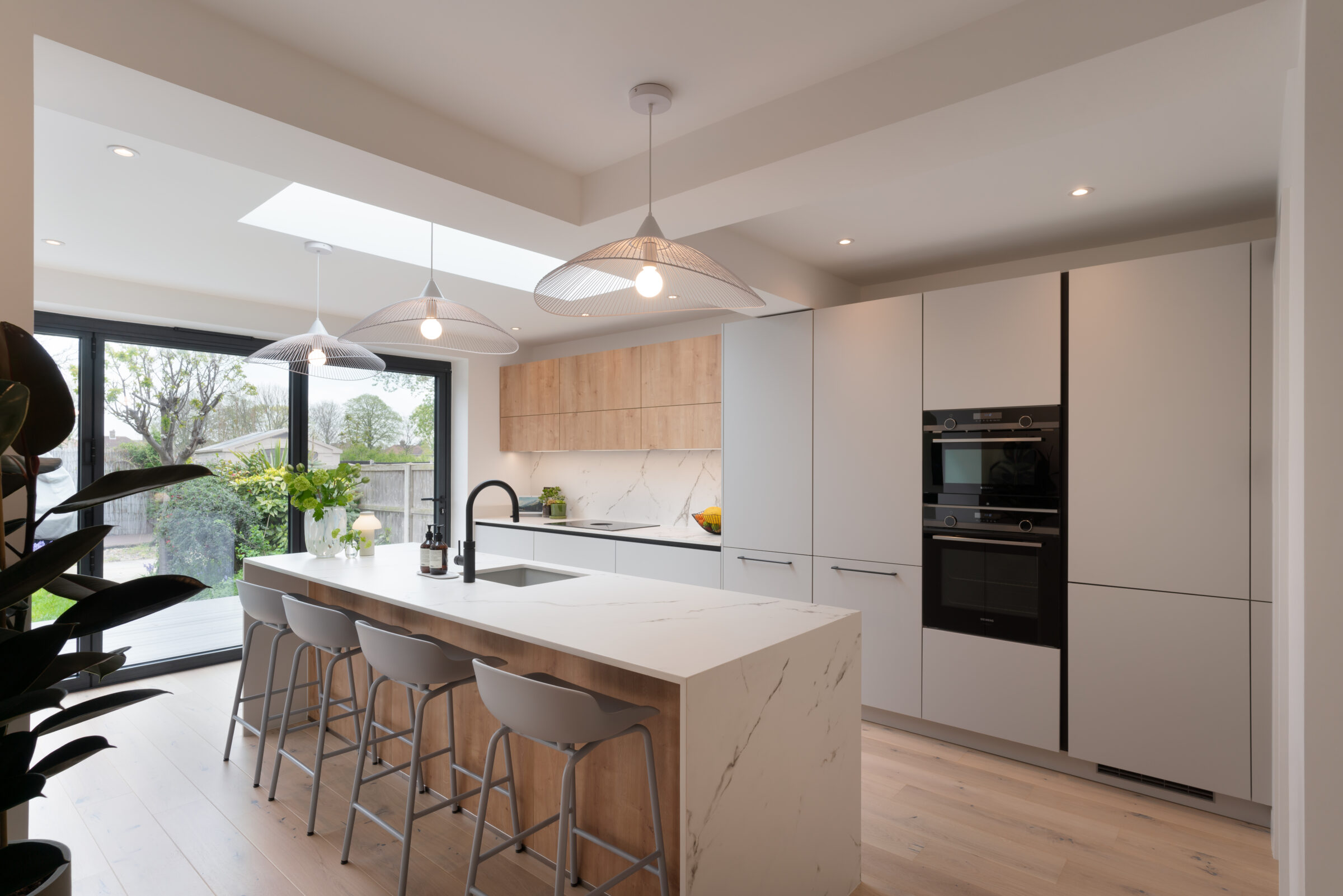 Design: The kitchen embraces clean lines, soothing tones, and natural touches, which makes it so universally appealing and inviting. The design features wall units and the kitchen island in a light Chalet Oak finish, bringing warmth and texture to the kitchen. This contemporary kitchen features the latest built-in Siemens appliances and a popular Bora induction hob with built-in extractor which keeps the entire room free from steam, grease, and odours. The Dekton Kairos worktop, inspired by Carrara marble, has a soft luminous white base and a distinctive grey veining.