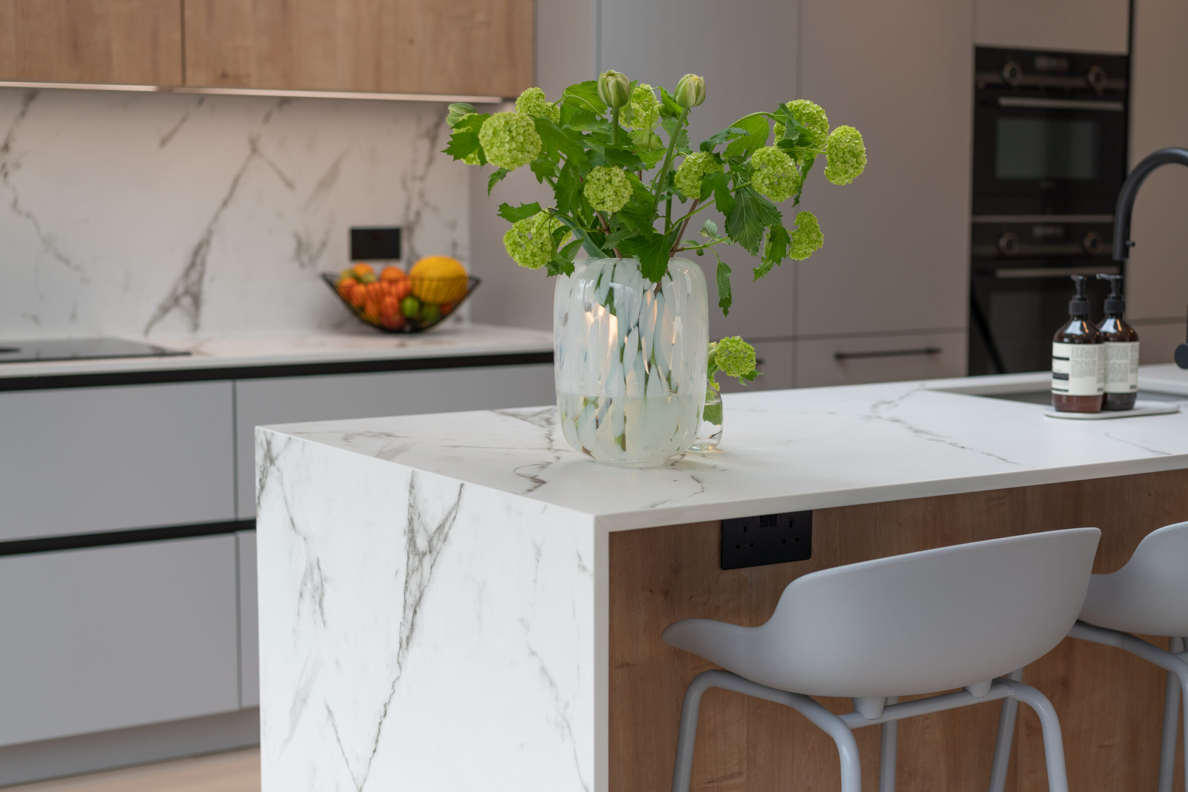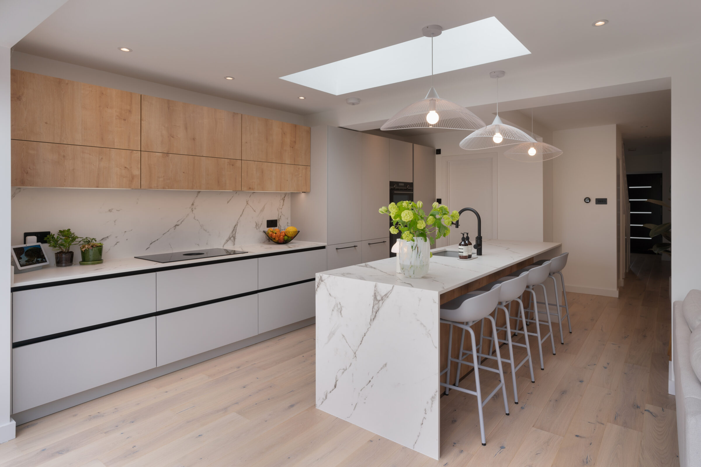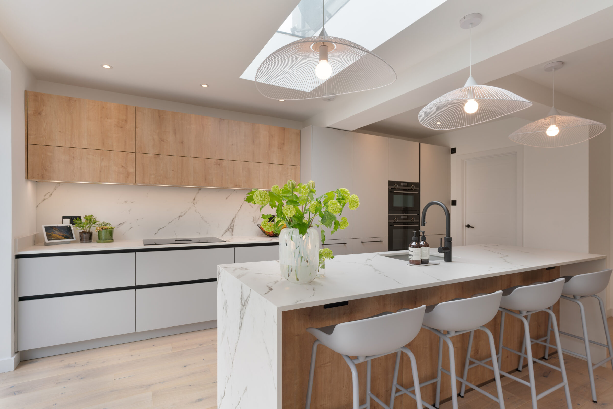 Design: The kitchen embraces clean lines, soothing tones, and natural touches, which makes it so universally appealing and inviting. The design features wall units and the kitchen island in a light Chalet Oak finish, bringing warmth and texture to the kitchen. This contemporary kitchen features the latest built-in Siemens appliances and a popular Bora induction hob with built-in extractor which keeps the entire room free from steam, grease, and odours. The Dekton Kairos worktop, inspired by Carrara marble, has a soft luminous white base and a distinctive grey veining.