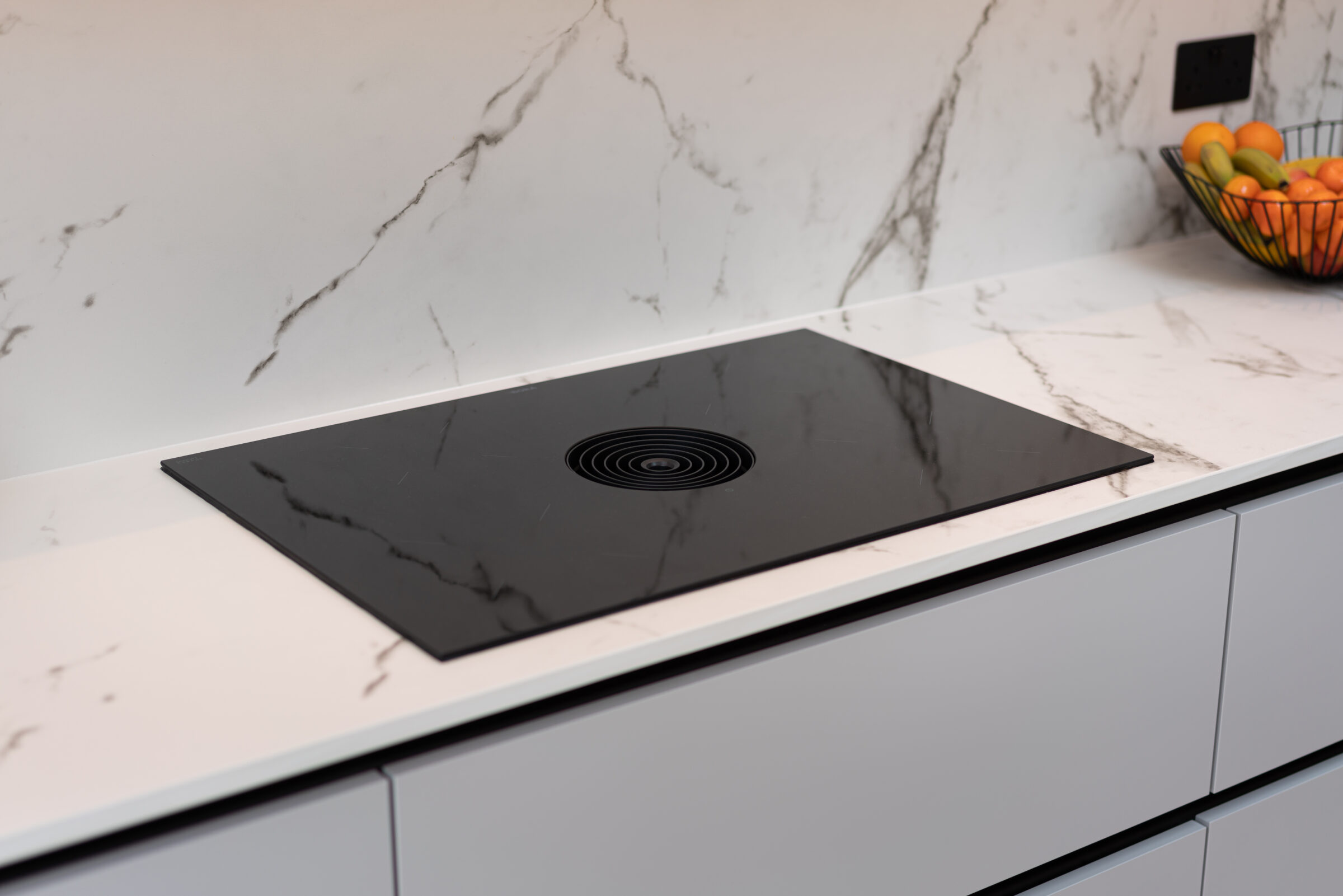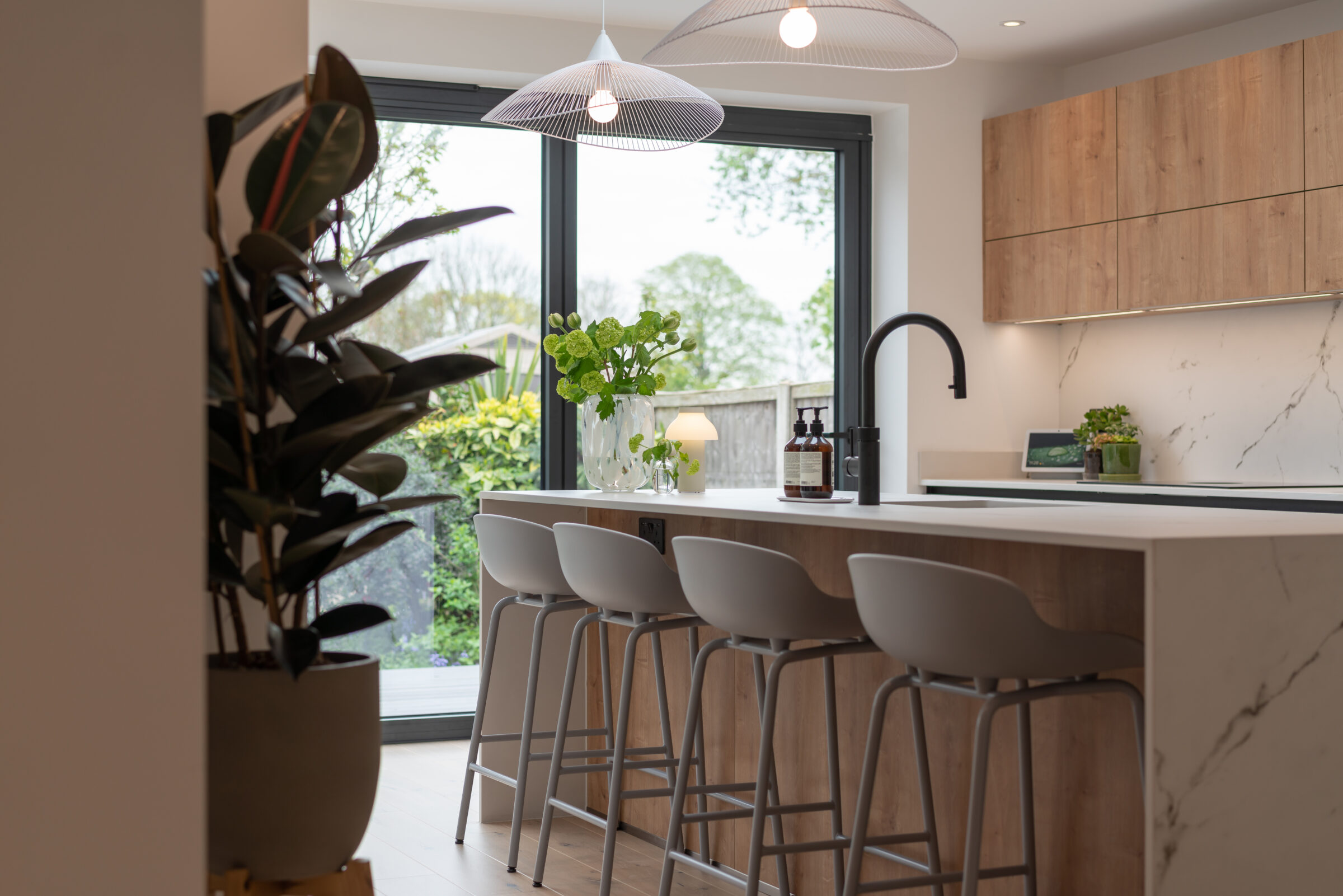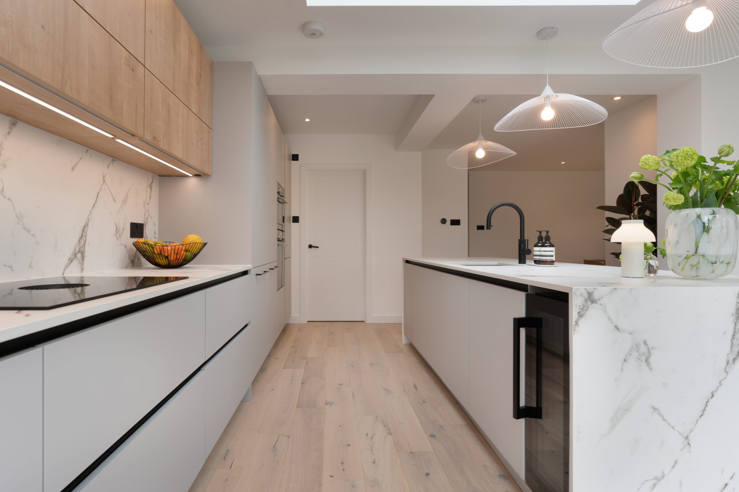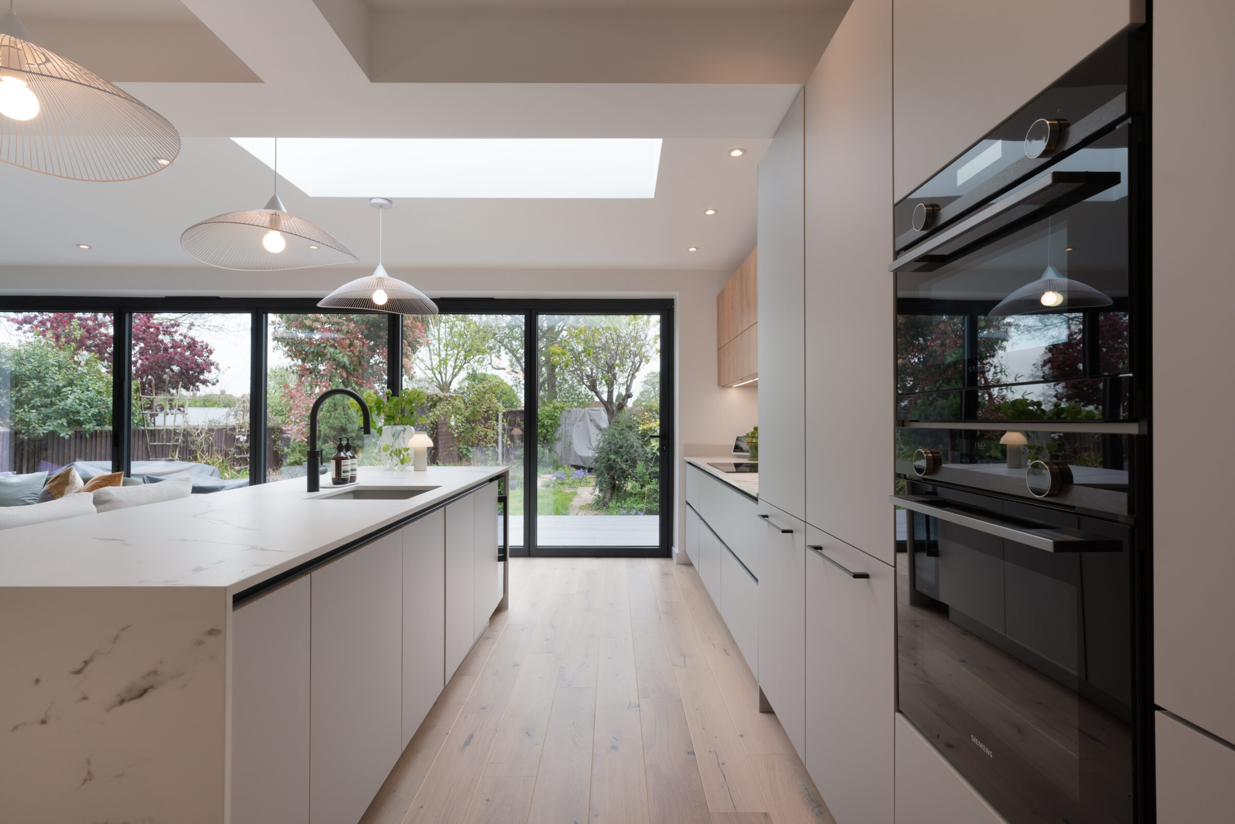 Design: The kitchen embraces clean lines, soothing tones, and natural touches, which makes it so universally appealing and inviting. The design features wall units and the kitchen island in a light Chalet Oak finish, bringing warmth and texture to the kitchen. This contemporary kitchen features the latest built-in Siemens appliances and a popular Bora induction hob with built-in extractor which keeps the entire room free from steam, grease, and odours. The Dekton Kairos worktop, inspired by Carrara marble, has a soft luminous white base and a distinctive grey veining.