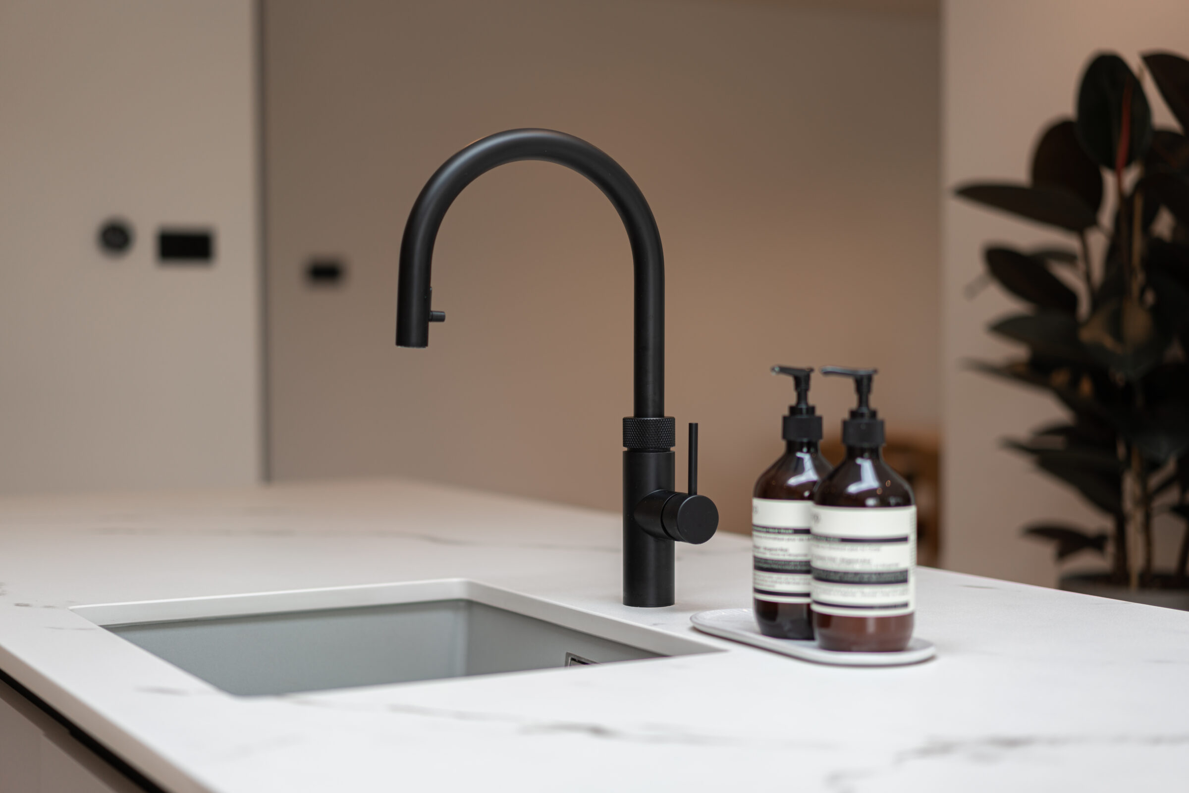 Brief : Mr. and Mrs. Smiles required a new kitchen for their newly refurbished home. They were looking for a contemporary kitchen with a functional layout, smart kitchen appliances, and good storage solutions. Neutral colours combined with wooden accents throughout, clean lines, and practical storage were to be the focal points. Good quality and long-lasting worktops were also important criteria for the design.