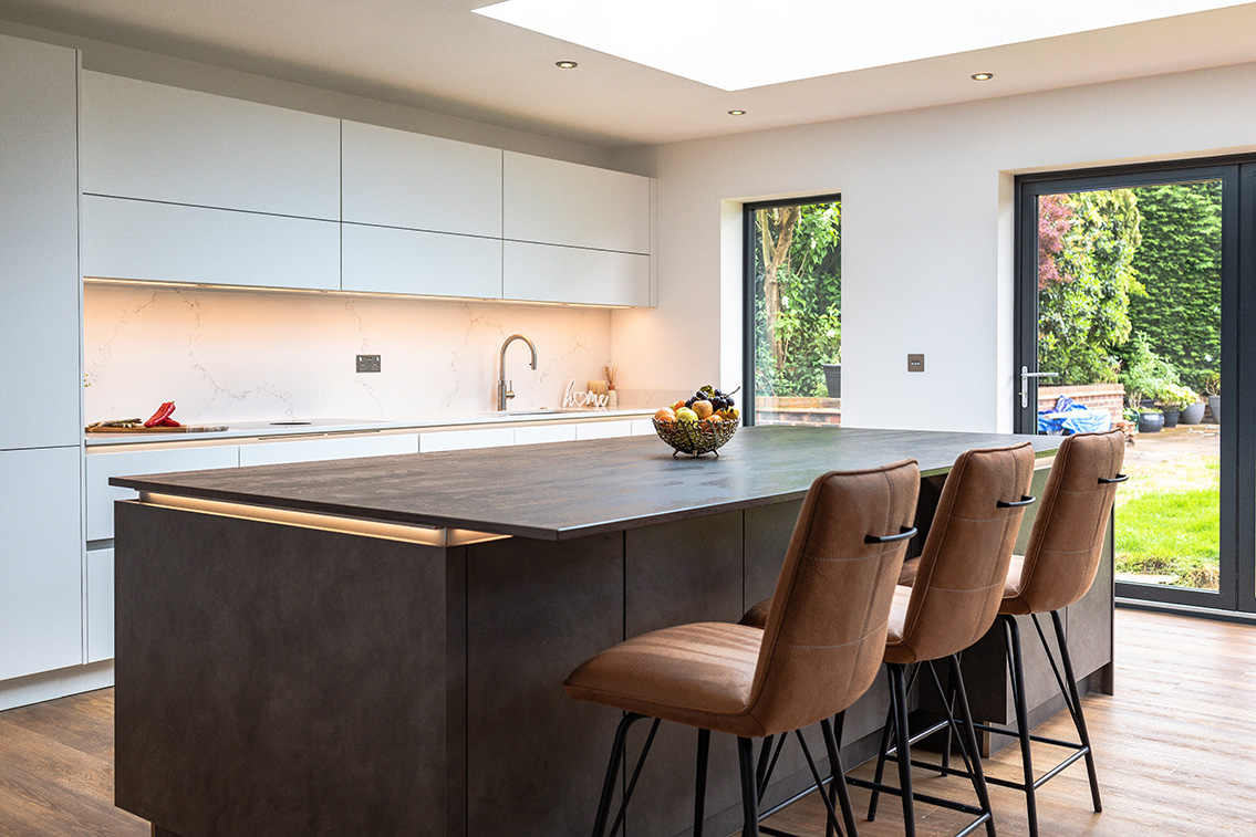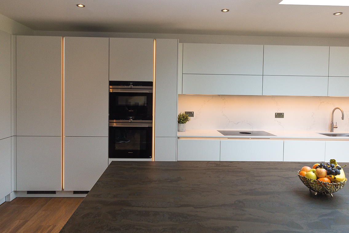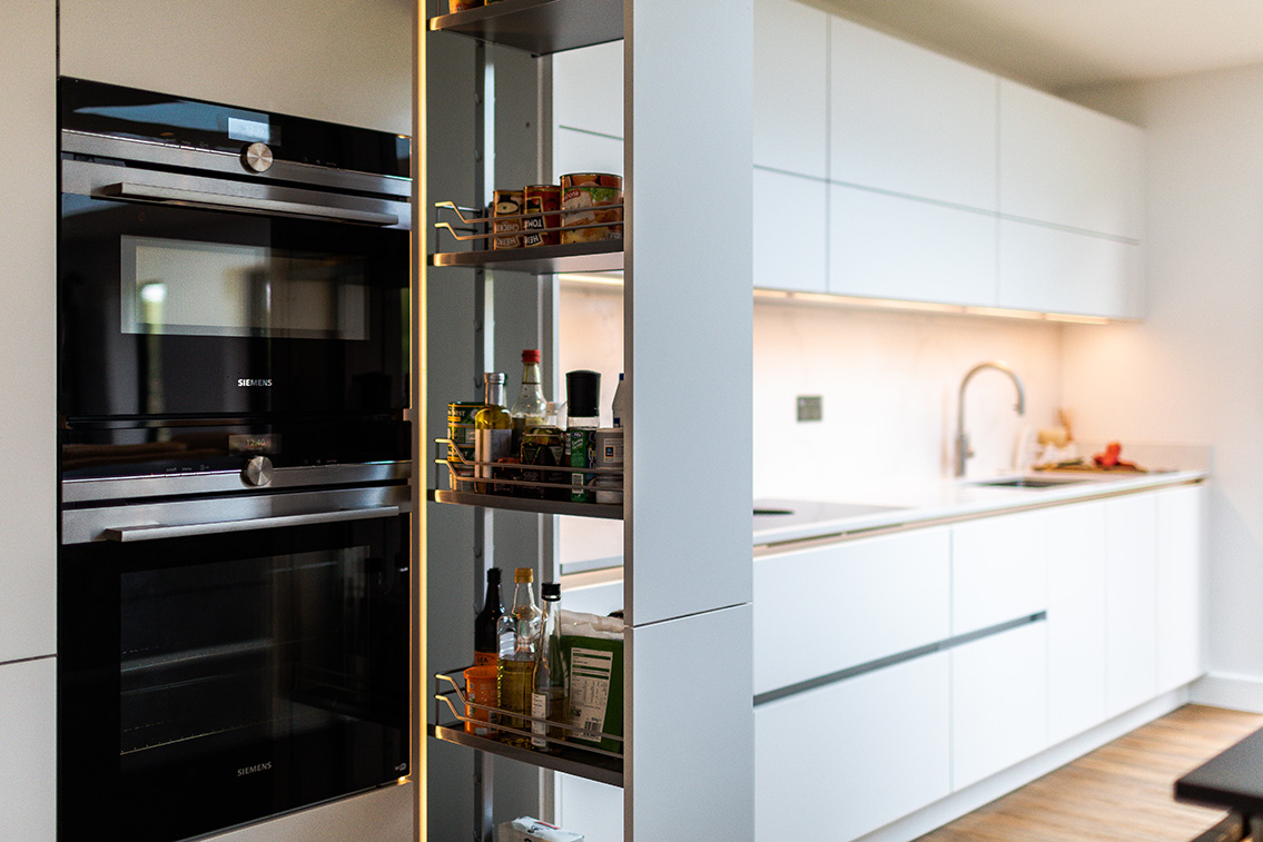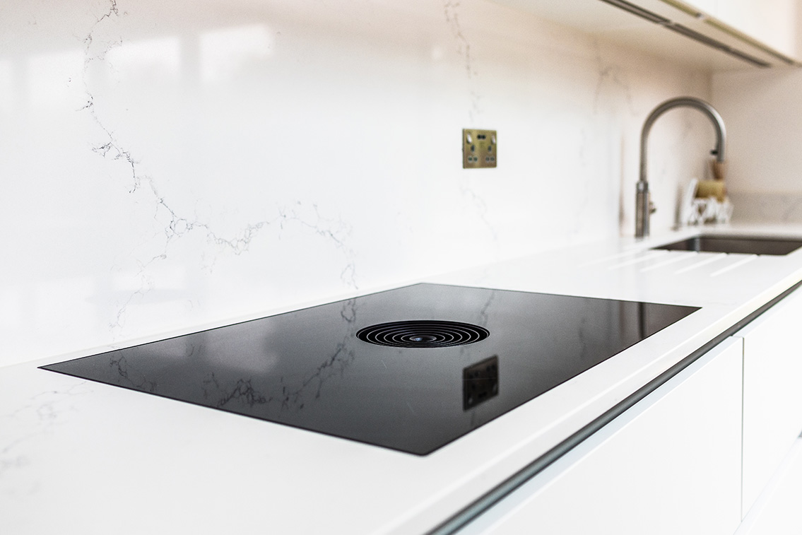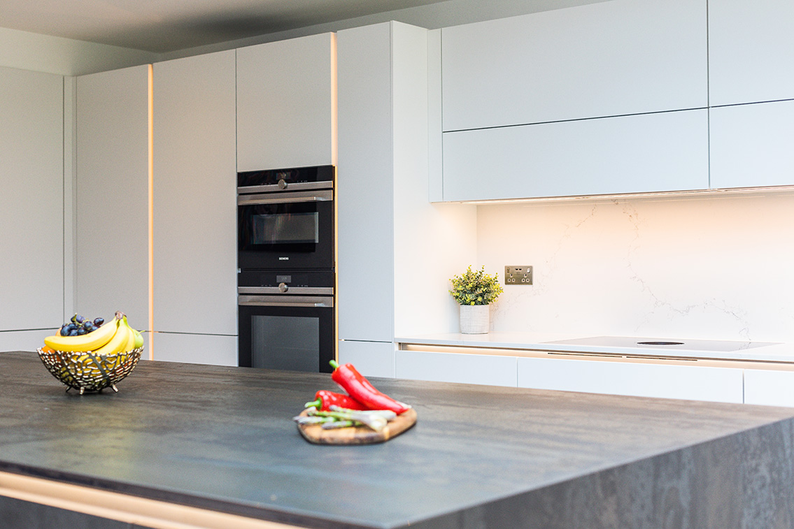 This contemporary kitchen has been designed in a White Soft Matt finish. Echoing our display at the Upminster showroom, this choice bathes the space in a gentle, luminous aura. A stunning Dekton Radium worktop complements the style of this kitchen, and it’s featuring high-end Siemens appliances, a Bora hob and Quooker tap.