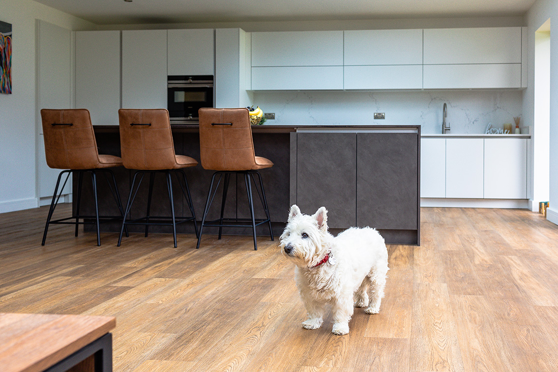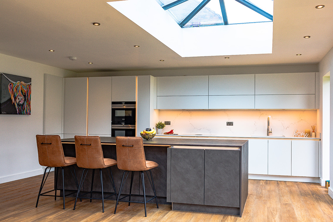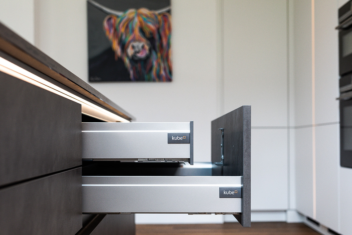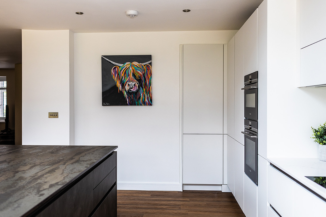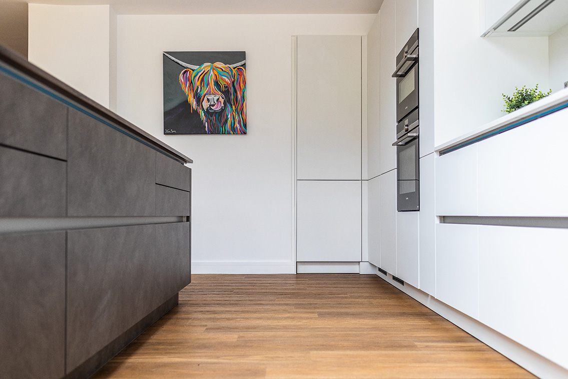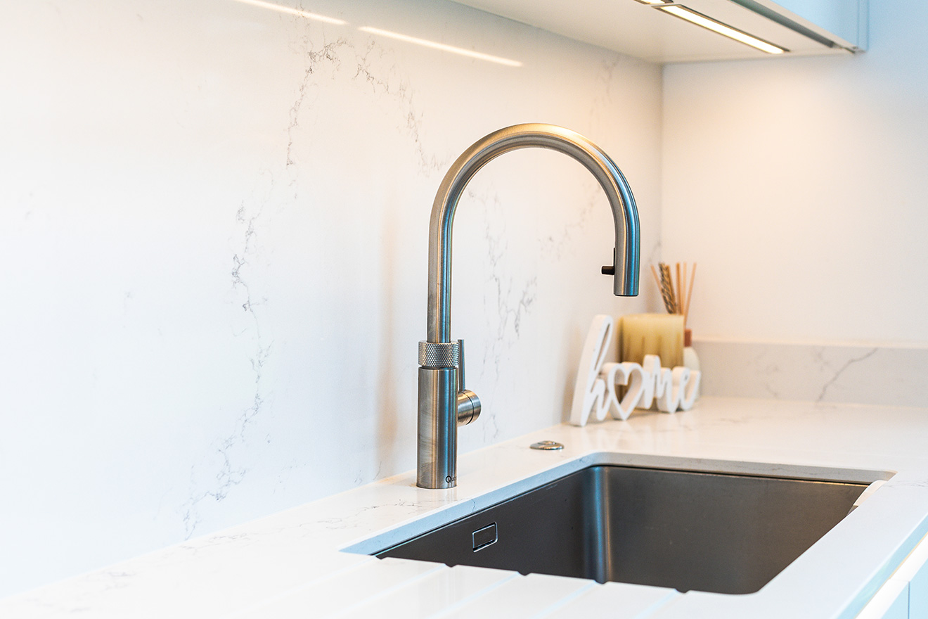 This contemporary kitchen has been designed in a White Soft Matt finish. Echoing our display at the Upminster showroom, this choice bathes the space in a gentle, luminous aura. A stunning Dekton Radium worktop complements the style of this kitchen, and it’s featuring high-end Siemens appliances, a Bora hob and Quooker tap.