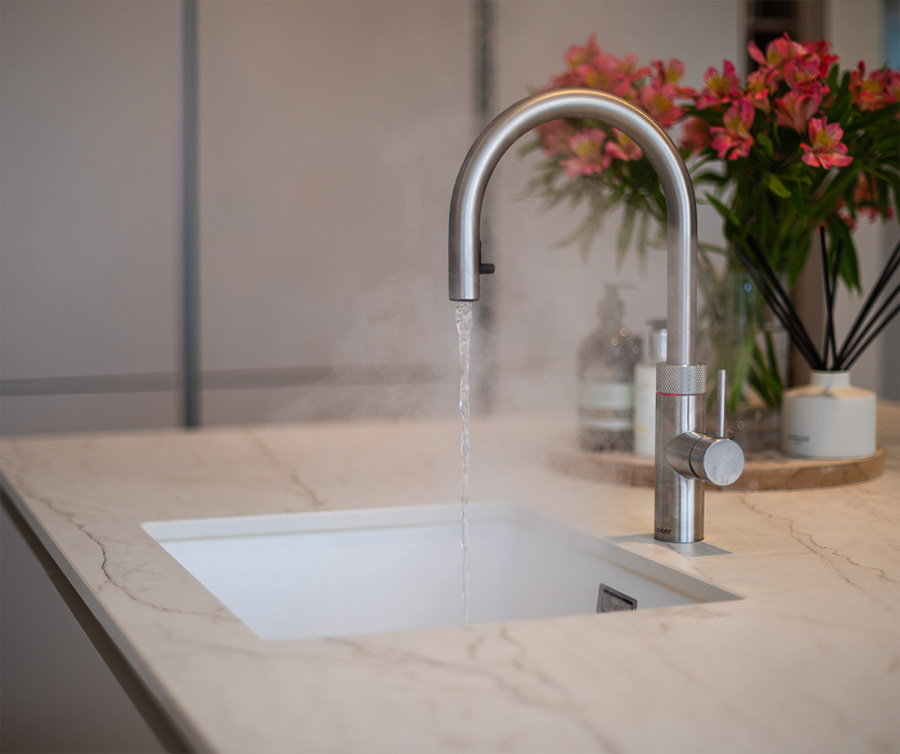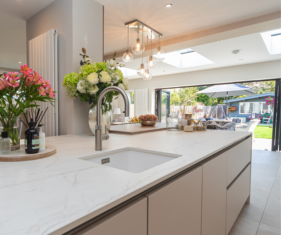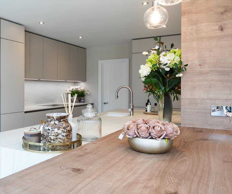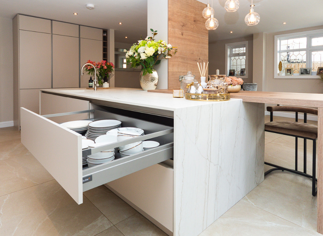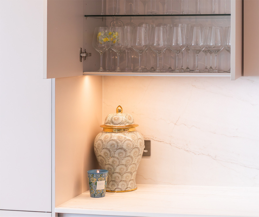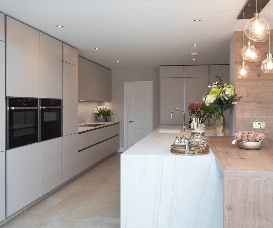 A smart kitchen, equipped with NEFF double ovens and a wine cooler. It features Dekton Neural Onirika, an innovative material is carbon neutral, durable and versatile. The extra deep pull-out drawer gives more space to store essentials. Stunning wall cladding in contrast with the Holm Oak breakfast bar. The extra high-wall units add more storage and style to the kitchen. This is a great choice for a modern and cosy space.