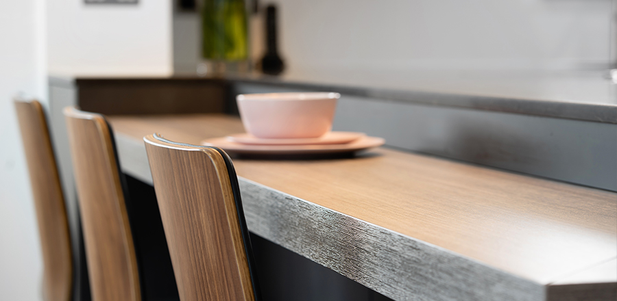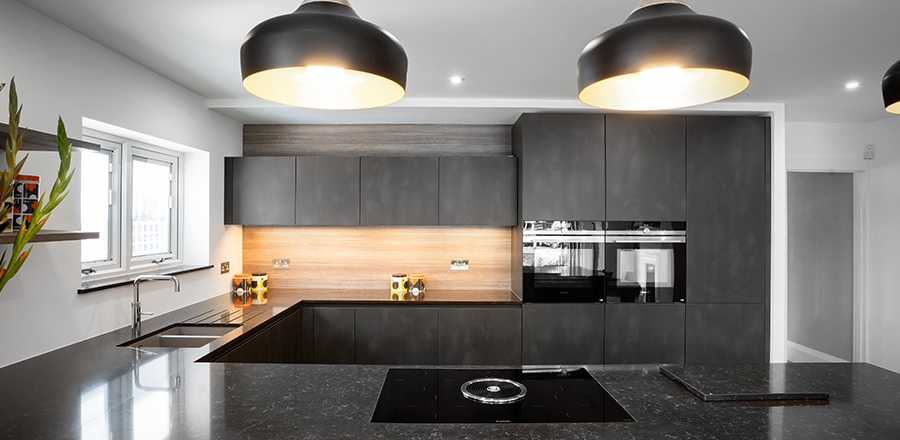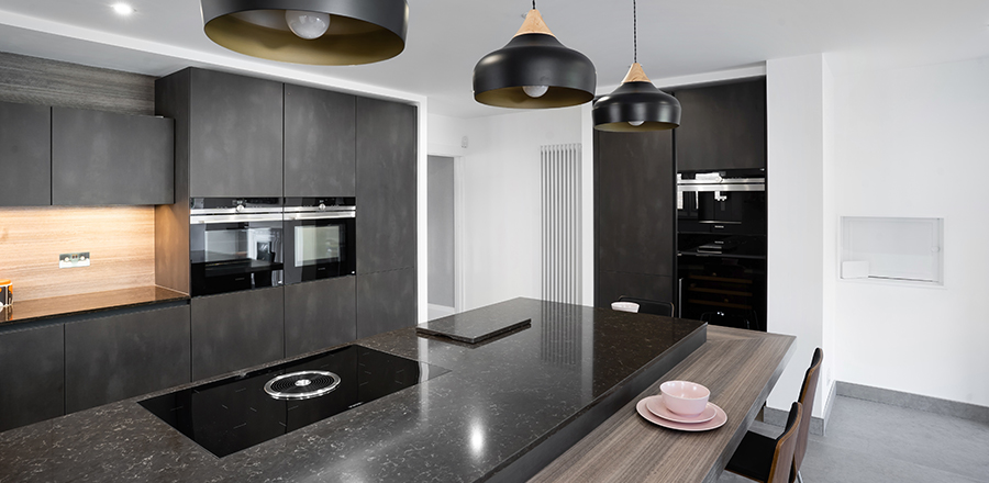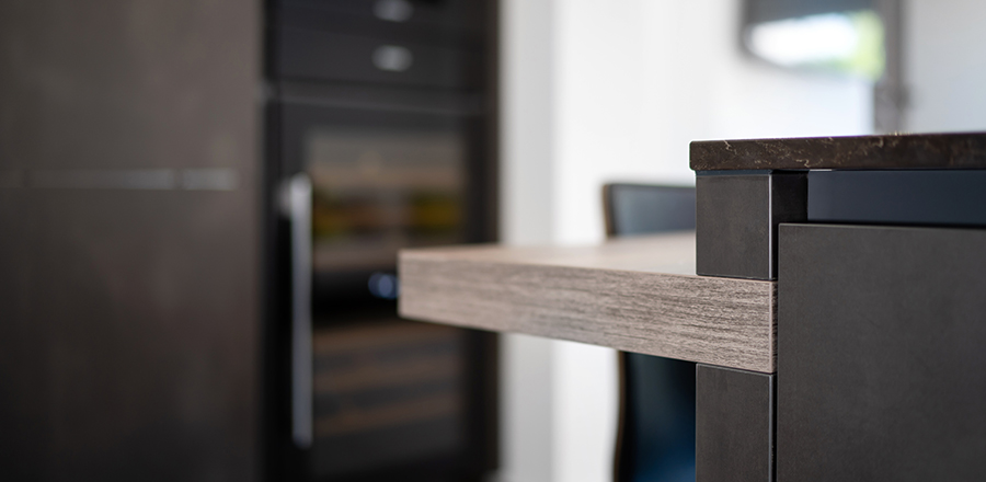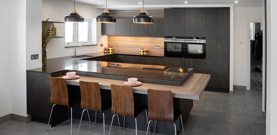This kitchen is from the Leicht Minera-C range in Kiruna. The Calypto wall cladding matches the sleek finishes on the breakfast bar. A CRL Stone worktop in Chestnut has an understated appeal. One of the primary focuses of our client, when designing this kitchen, was to create a social space that would be ideal for entertaining. We achieved this requirement by framing the breakfast bar with gable panels in the same material as the door fronts.